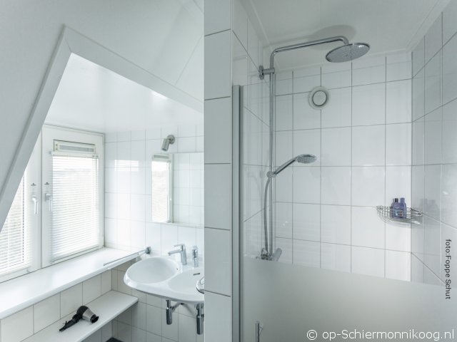 Badkamer met 2 wastafels, douche en toilet.