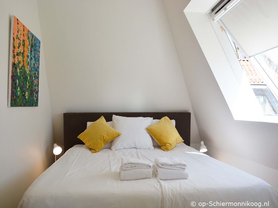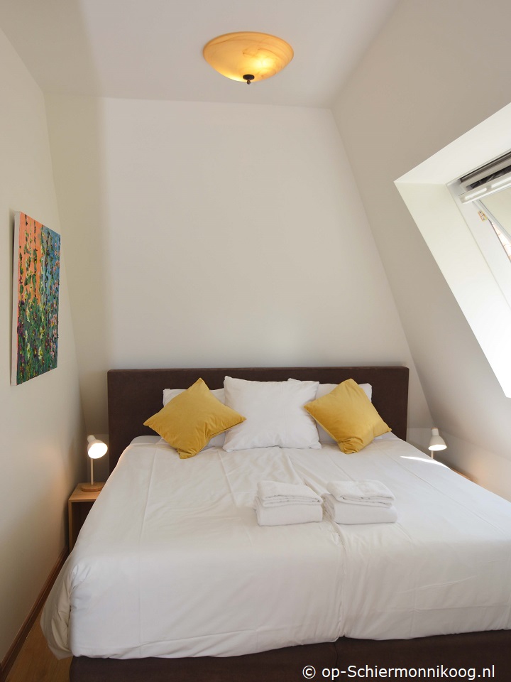 Slaapkamer met een tweepersoonsbed.