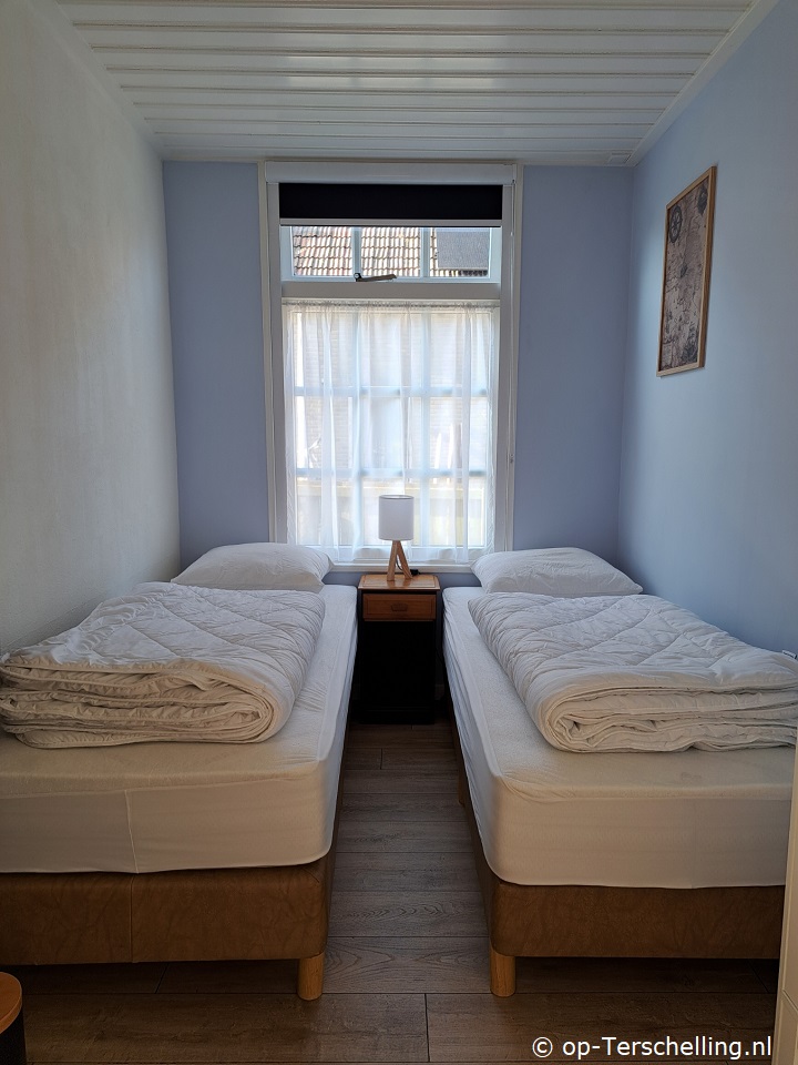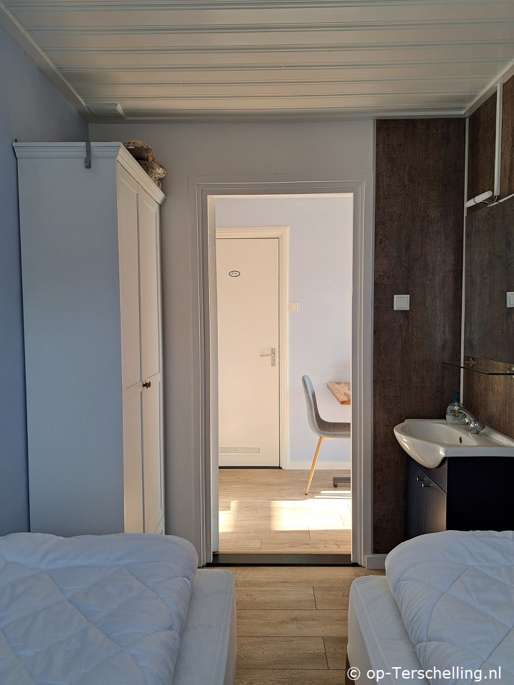 Slaapkamer met twee eenpersoonsbedden en wastafel.